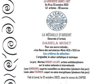 Mon dernier prix/My last award : La Médaille d'argent, pour l’originalité, la valeur esthétique et technique, L'exposition concours : « LA DIVERSITÉ DANS L’ART », CAPSQ, Centre Léonardo da Vinci, Montréal, octobre 2022