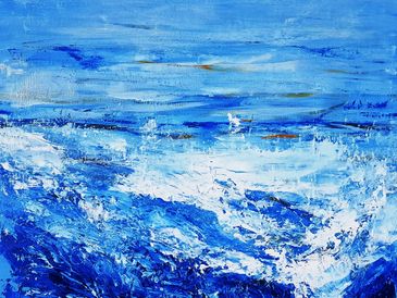 C'est par des lignes et des courbes très gestuelles, réalisées en coup de pinceaux ou de spatules, que mes oeuvres vibrent fortement en moi et avec moi, autant sur les cimes des montagnes résonant le déferlement d'un bruit de vagues que dans le plus profond silence du ciel. Les bleus du ciel et de la mer me fascinent par leur mystère irrésolu et leur inégalable profondeur.